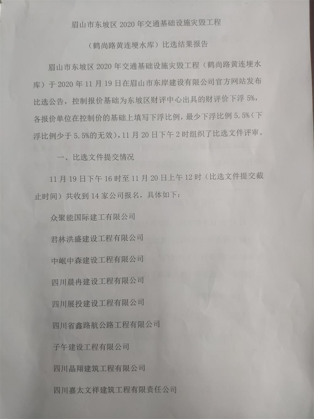 眉山市東坡區(qū)2020年交通基礎(chǔ)設(shè)施災(zāi)毀工程(鶴尚路黃連埂水庫(kù))勞務(wù)隊(duì)伍比選結(jié)果